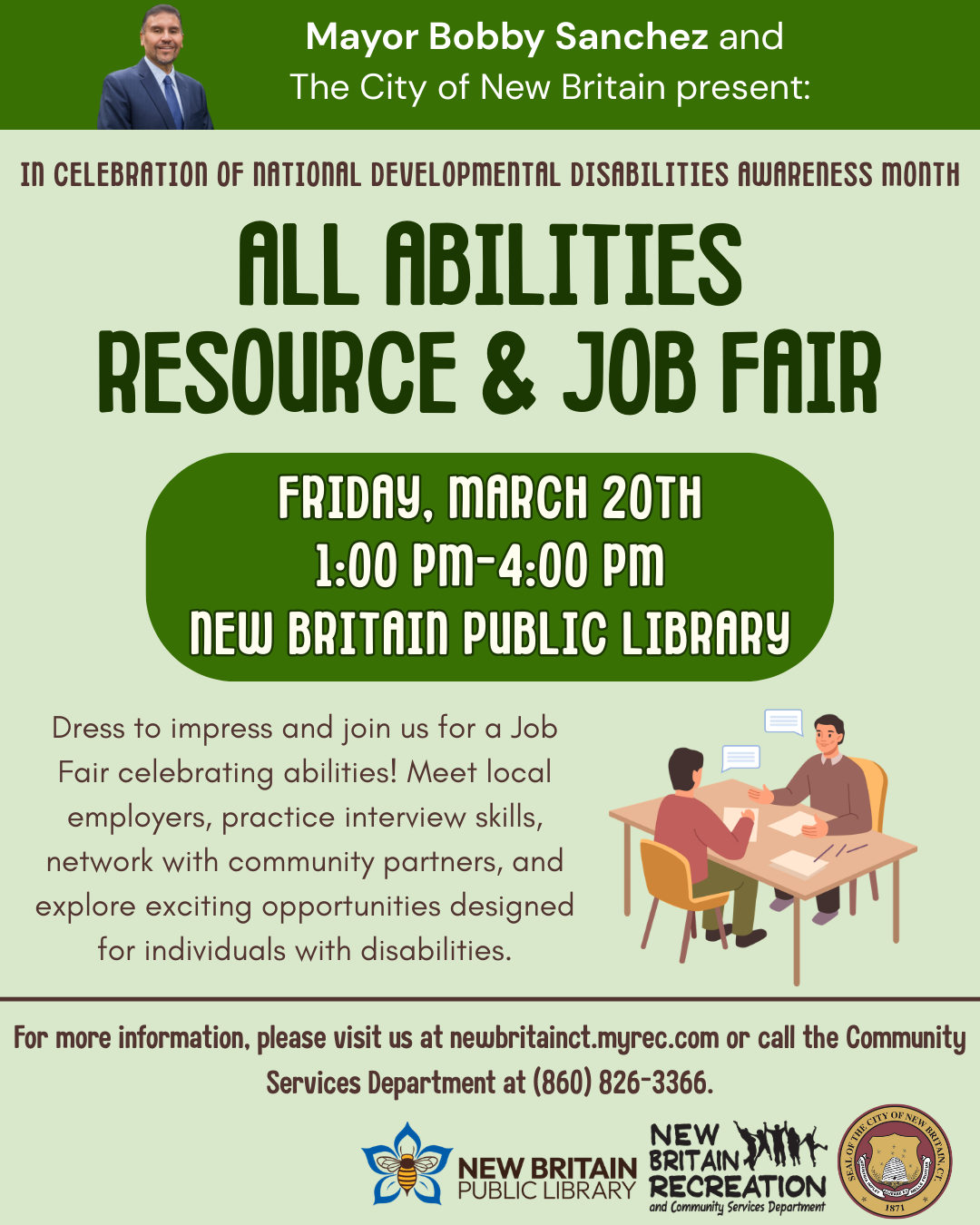 This event is in the "Adults" group Mar 20 2026 Fri All Ability Job and Career Resource Fair 1:00pm–4:00pm Adults Main Library This event is in the "Adults" group Mar 20 2026 Fri All Ability Job and Career Resource Fair 1:00pm–4:00pm Main Library Library Branch: Main Library Room: Community Room Full Age Group: Adults Program Type: Community Conversation, Job Help, Learn from the Expert Event Details: